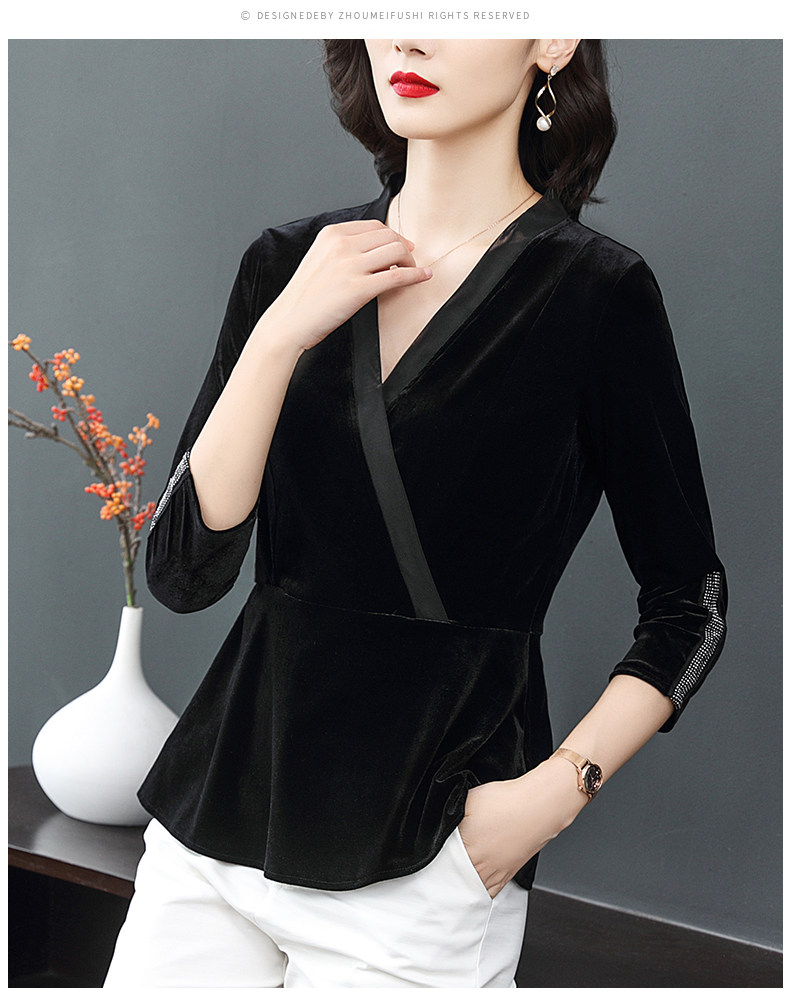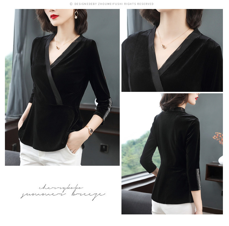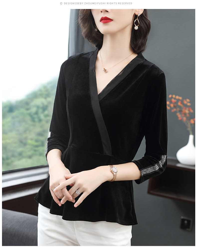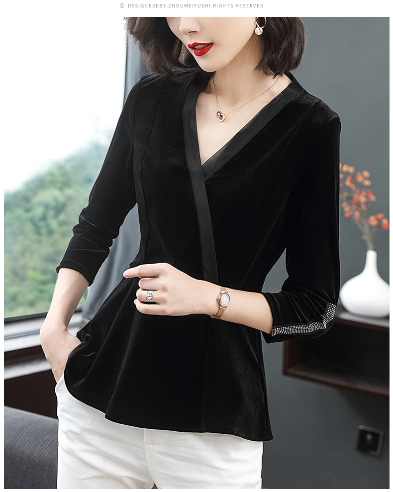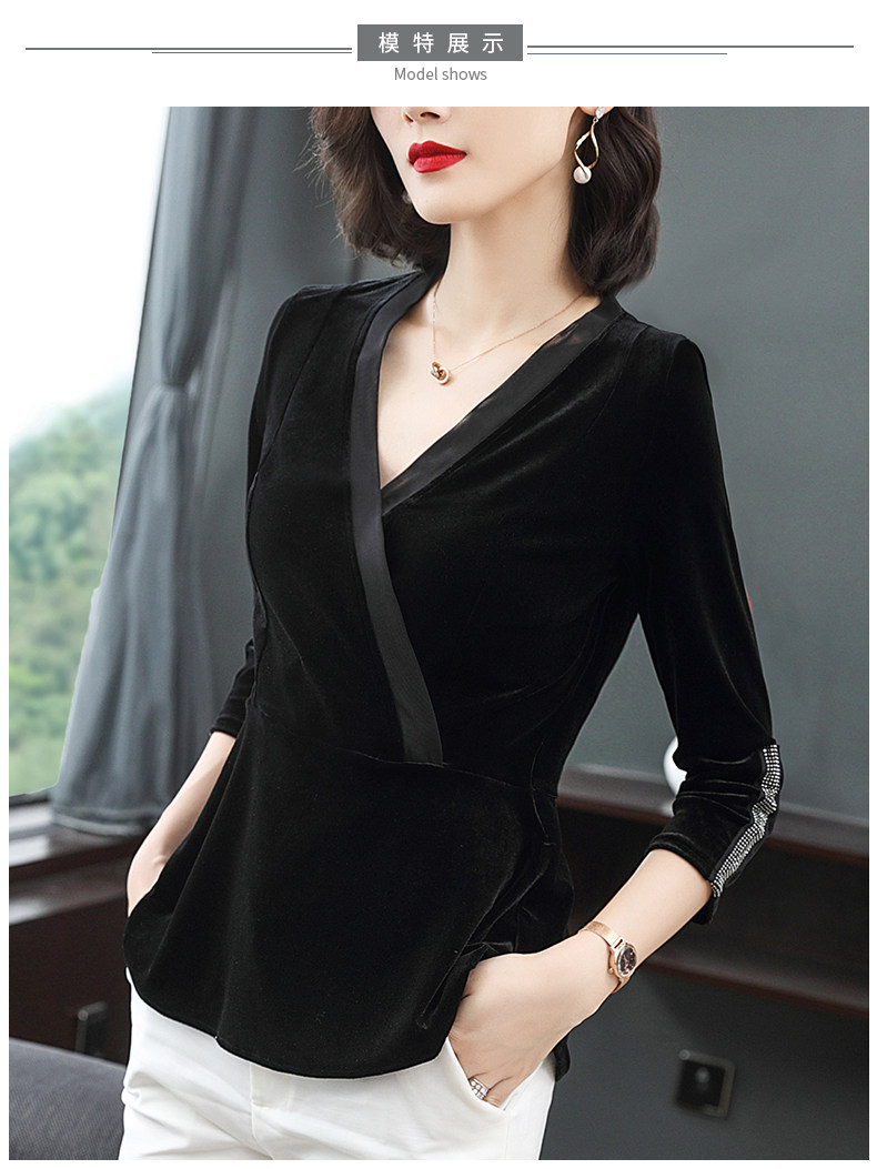 黑色V领秋款上衣长袖修身欧货时尚