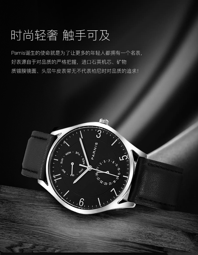 日本进口机芯,进口矿物质强化镜面,316L精钢表壳,头层小牛皮表带,950家售后网点,联保五年,30米生活防水,时尚轻奢,触手可及