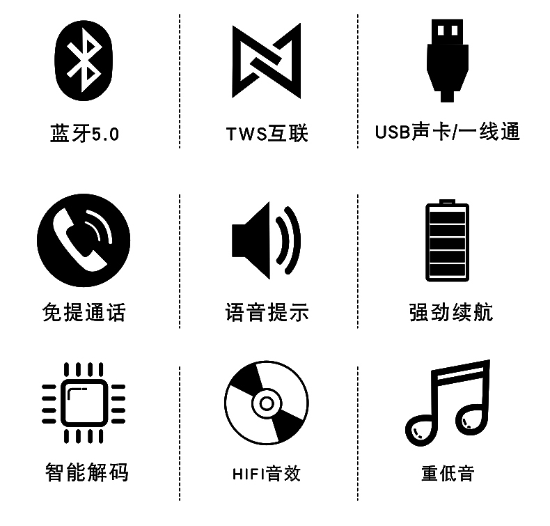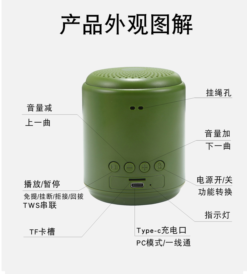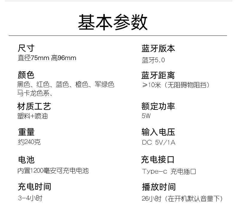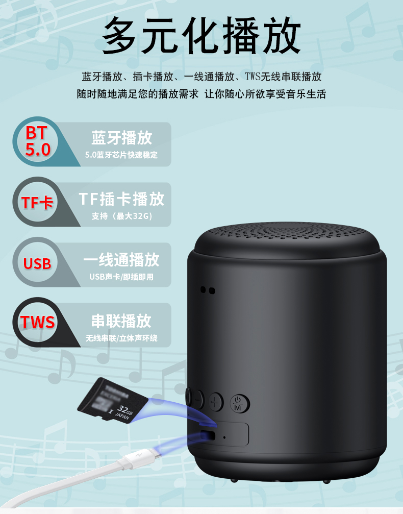 新升级蓝牙5.0,兼容性稳定性,功能性等有明显的提升。震撼低音,立体音效声临其境!免提通话,高清降噪。全面兼容,多种模式一键切换,小巧更实用~