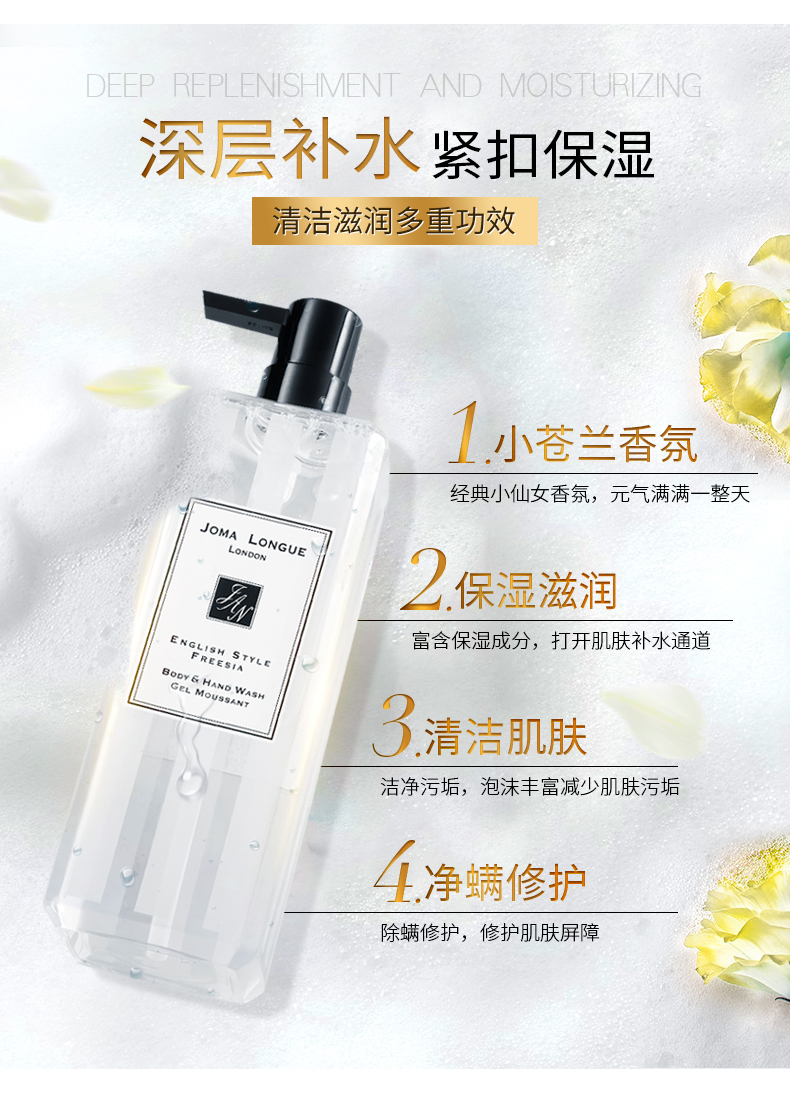 进口祖马龙小苍兰香氛,国际调香师团队倾心打造,高贵淡雅怡人,挑战72小时持久留香,深层温和洁净,滋润肌肤,补水保湿,改善肤质,轻松洗出香、嫩、滑,令肌肤水润嫩白