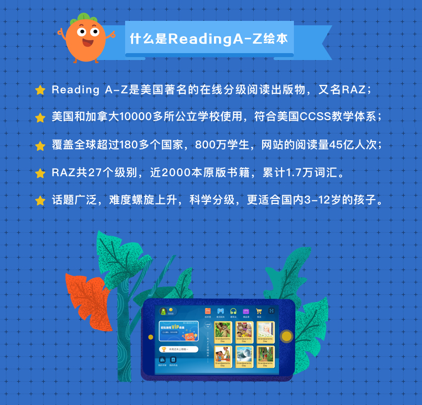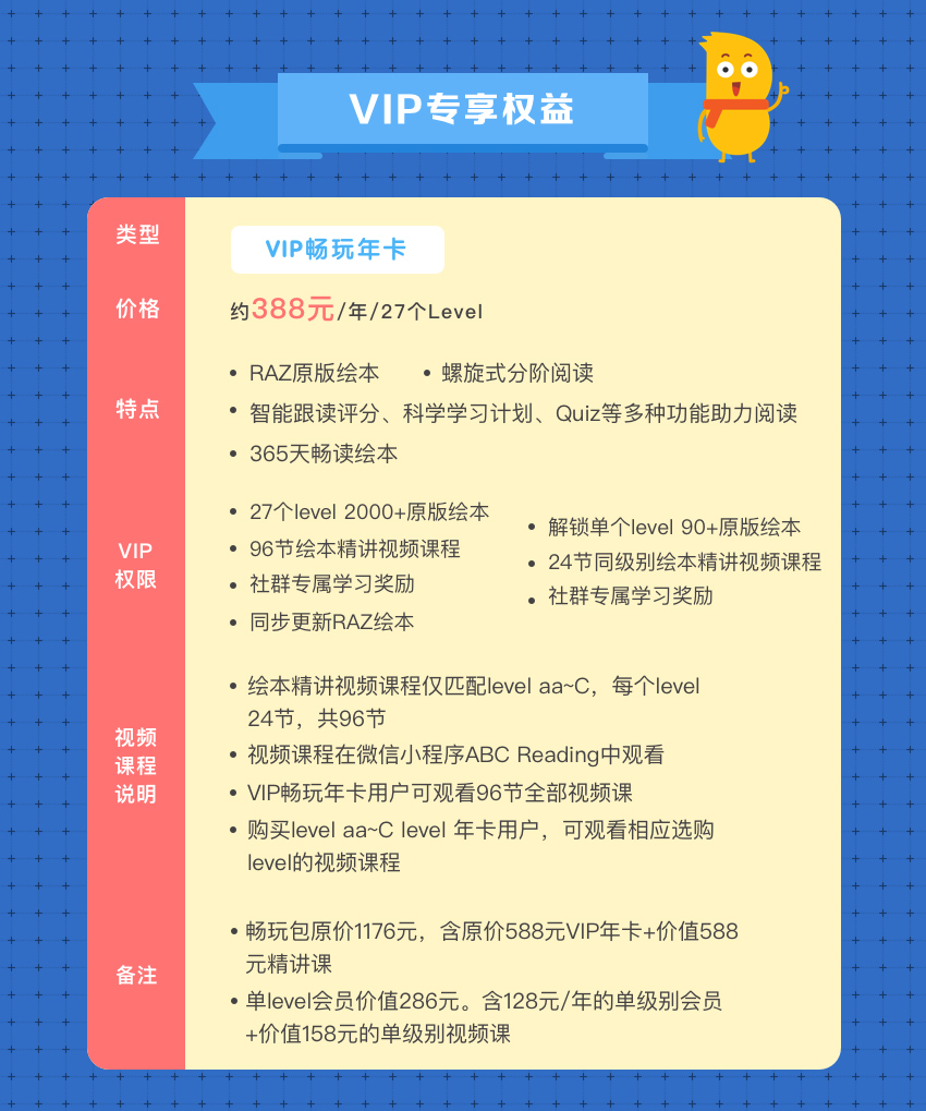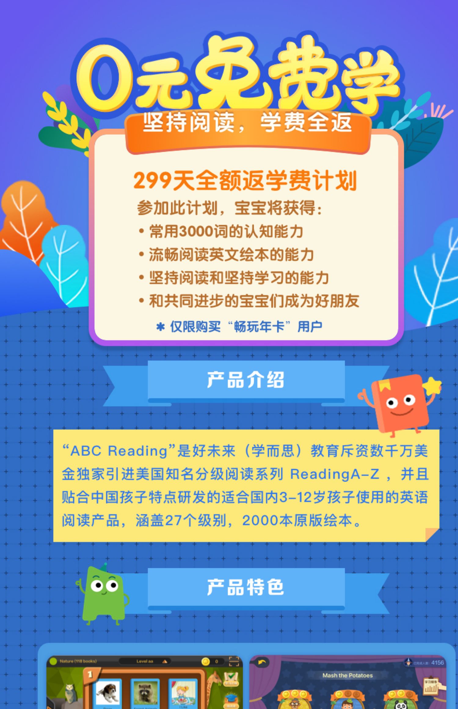 【学而思】ABCReading引进美国RAZ分级学习,适合国内3-12岁的孩子。现在买1年还多送1个月,券后仅需388元。下单即送单词卡套装一份,累计打卡299天还能全额返学费。