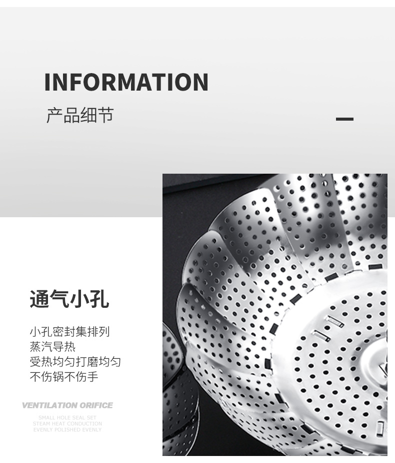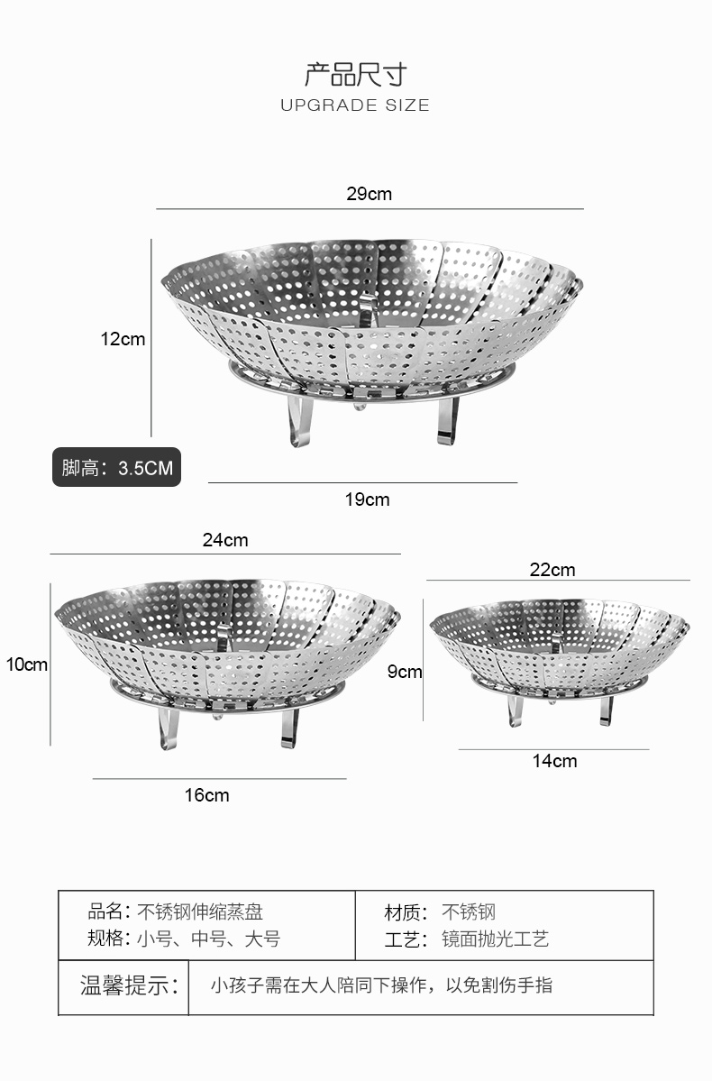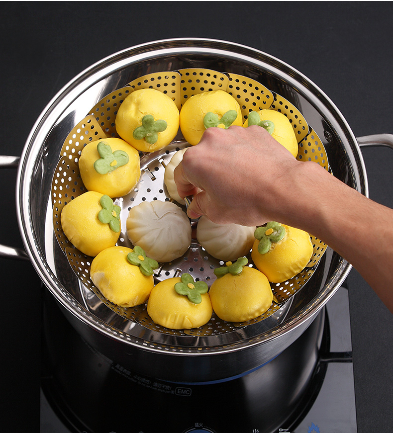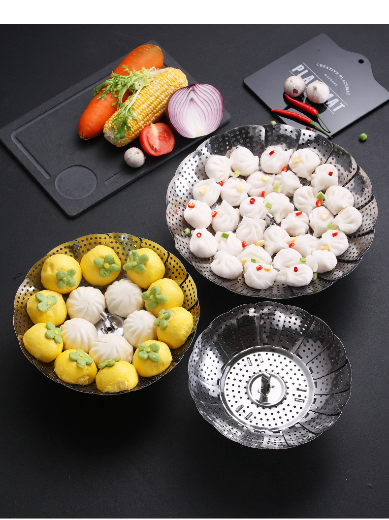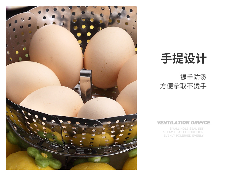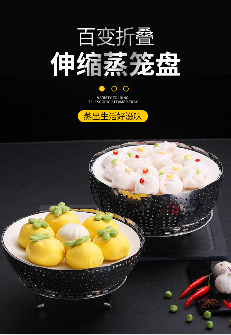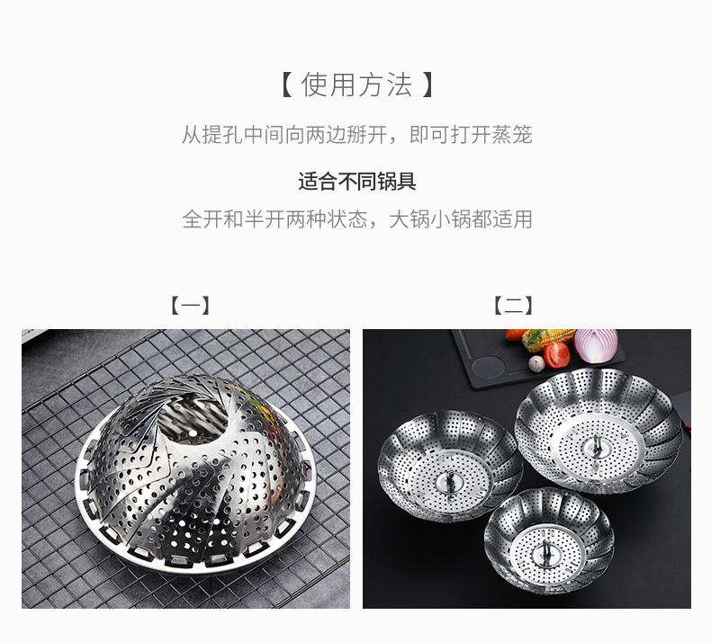超多功能~可以伸缩的蒸笼!食品类不锈钢,蒸汽孔分布均匀,易收纳不占地!蒸包子啥的更快熟!还是可伸缩开口大小,各种锅具都可用!还可装水果蔬菜哦~