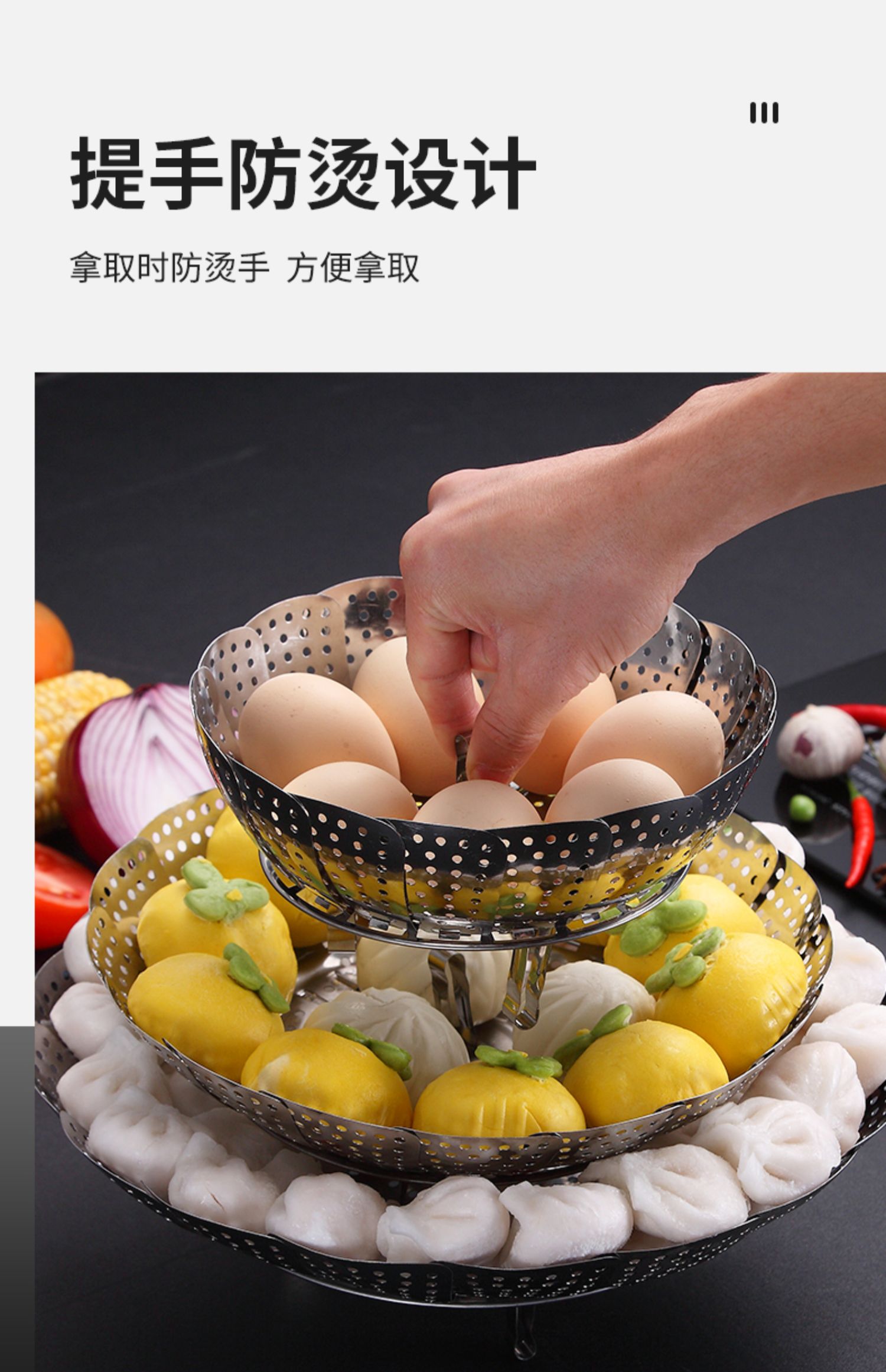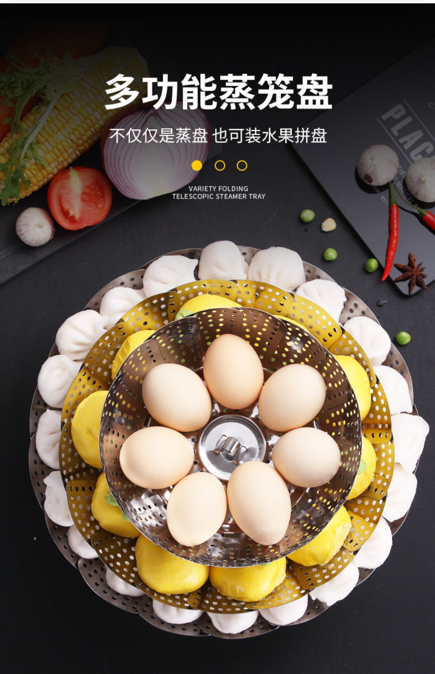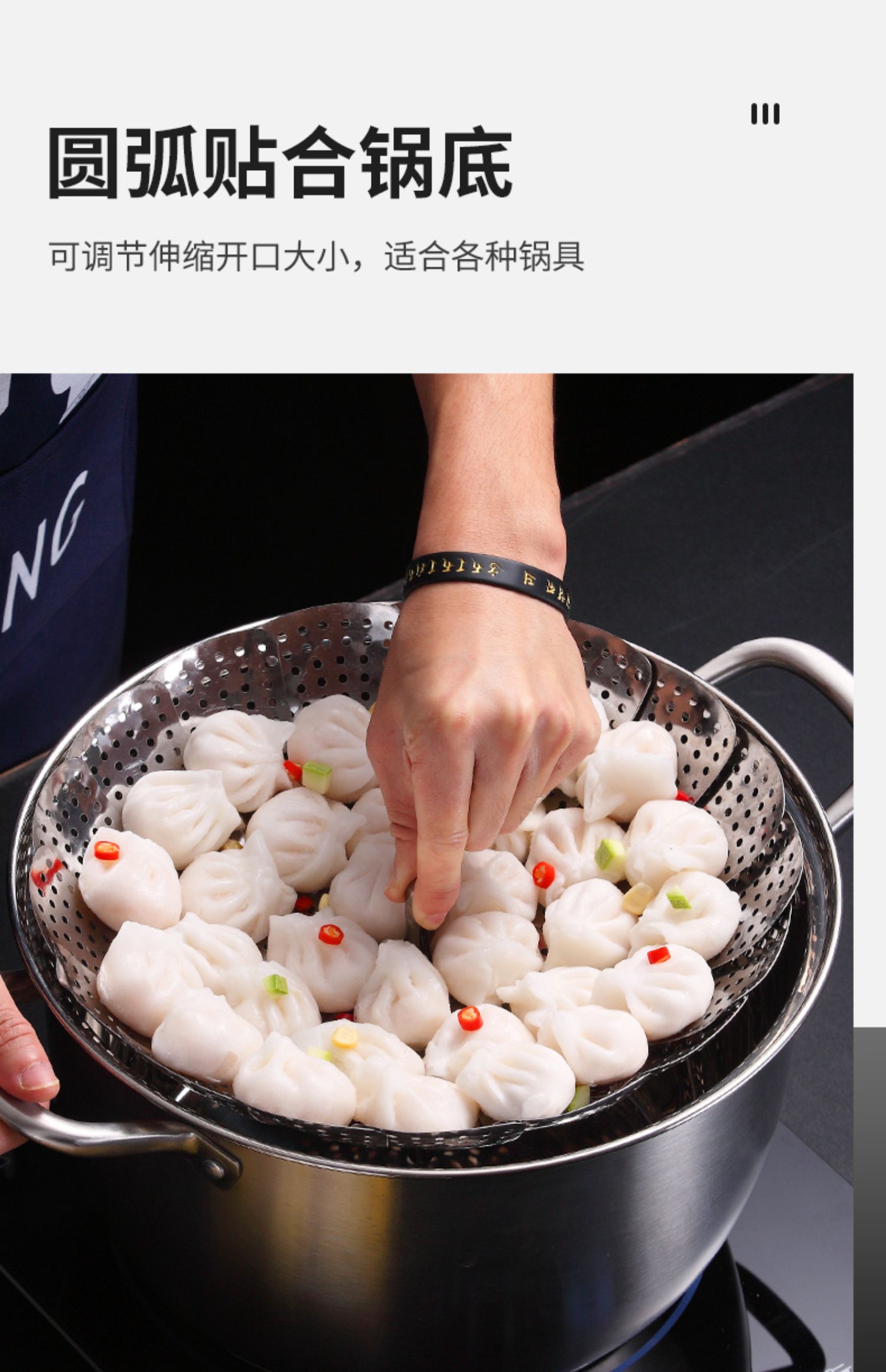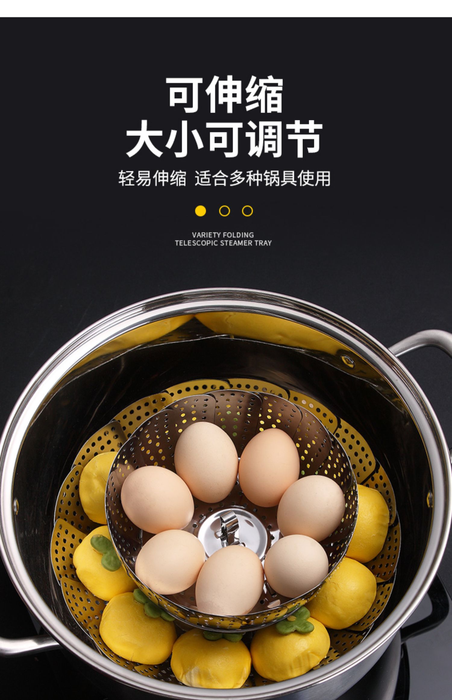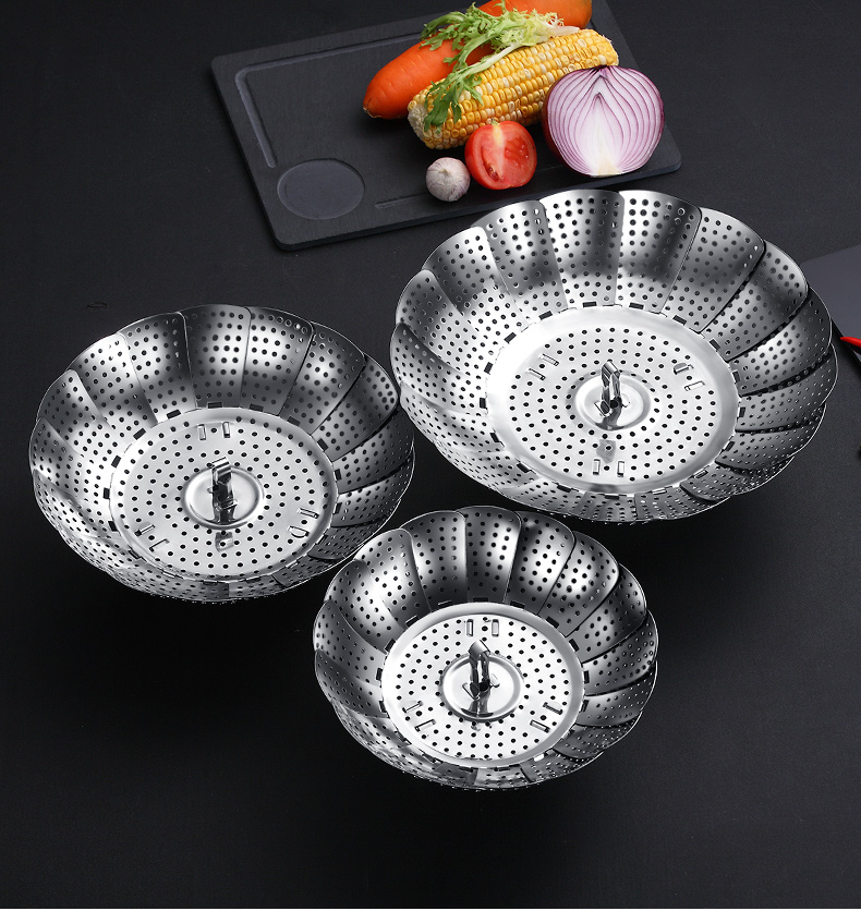 超多功能~可以伸缩的蒸笼!食品类不锈钢,蒸汽孔分布均匀,易收纳不占地!蒸包子啥的更快熟!还是可伸缩开口大小,各种锅具都可用!还可装水果蔬菜哦~
