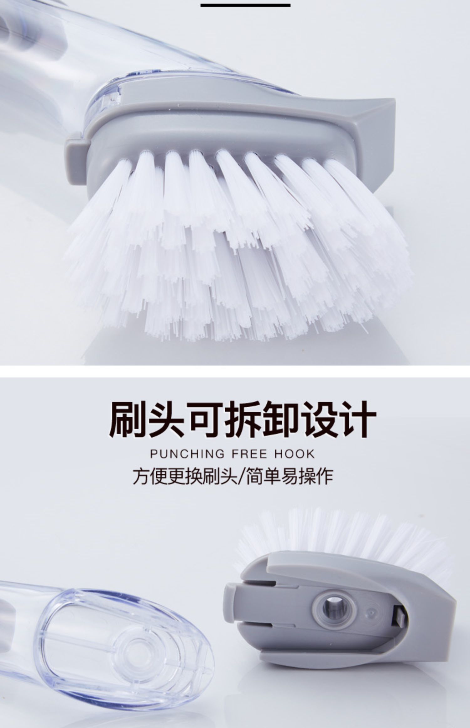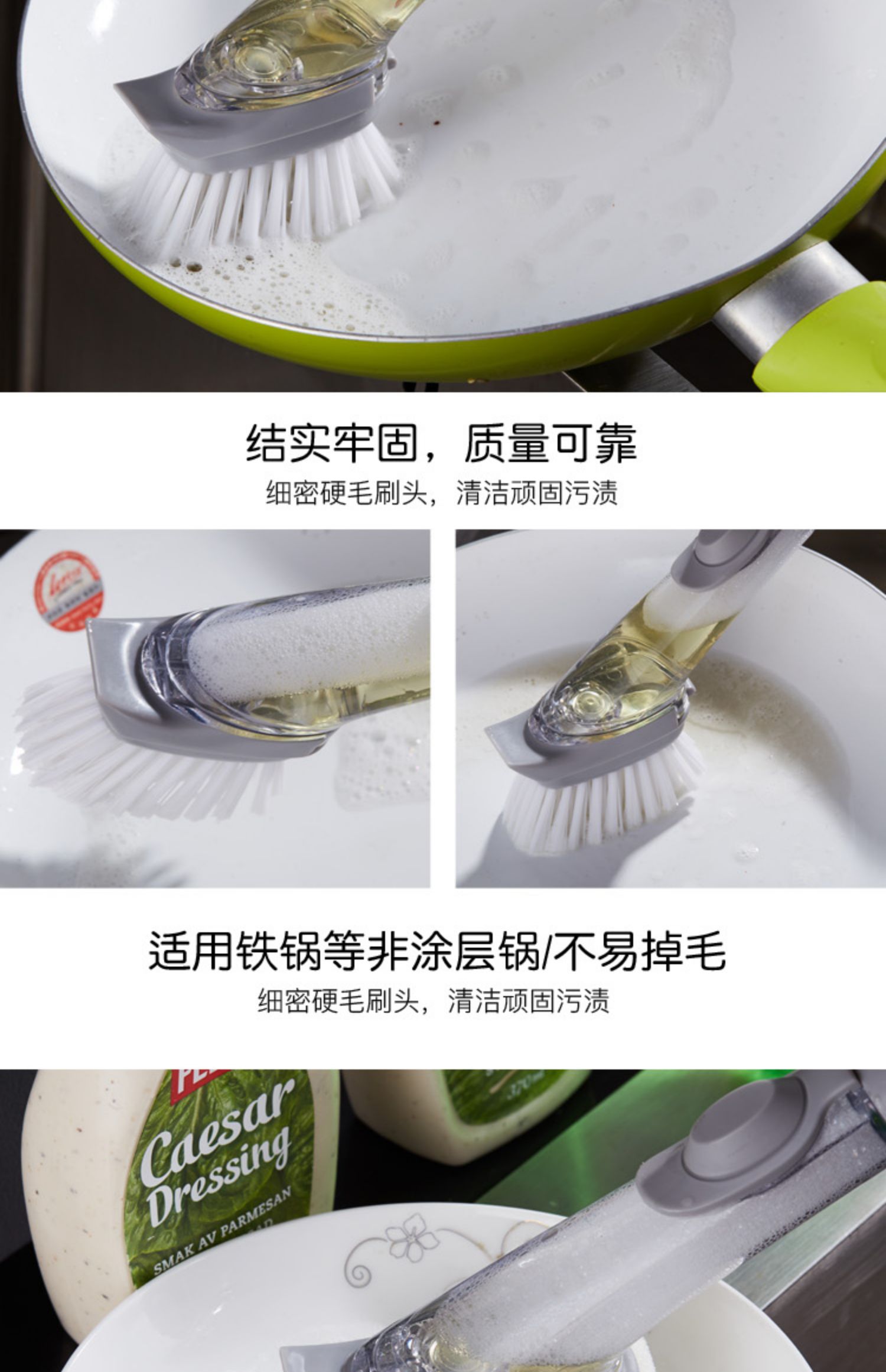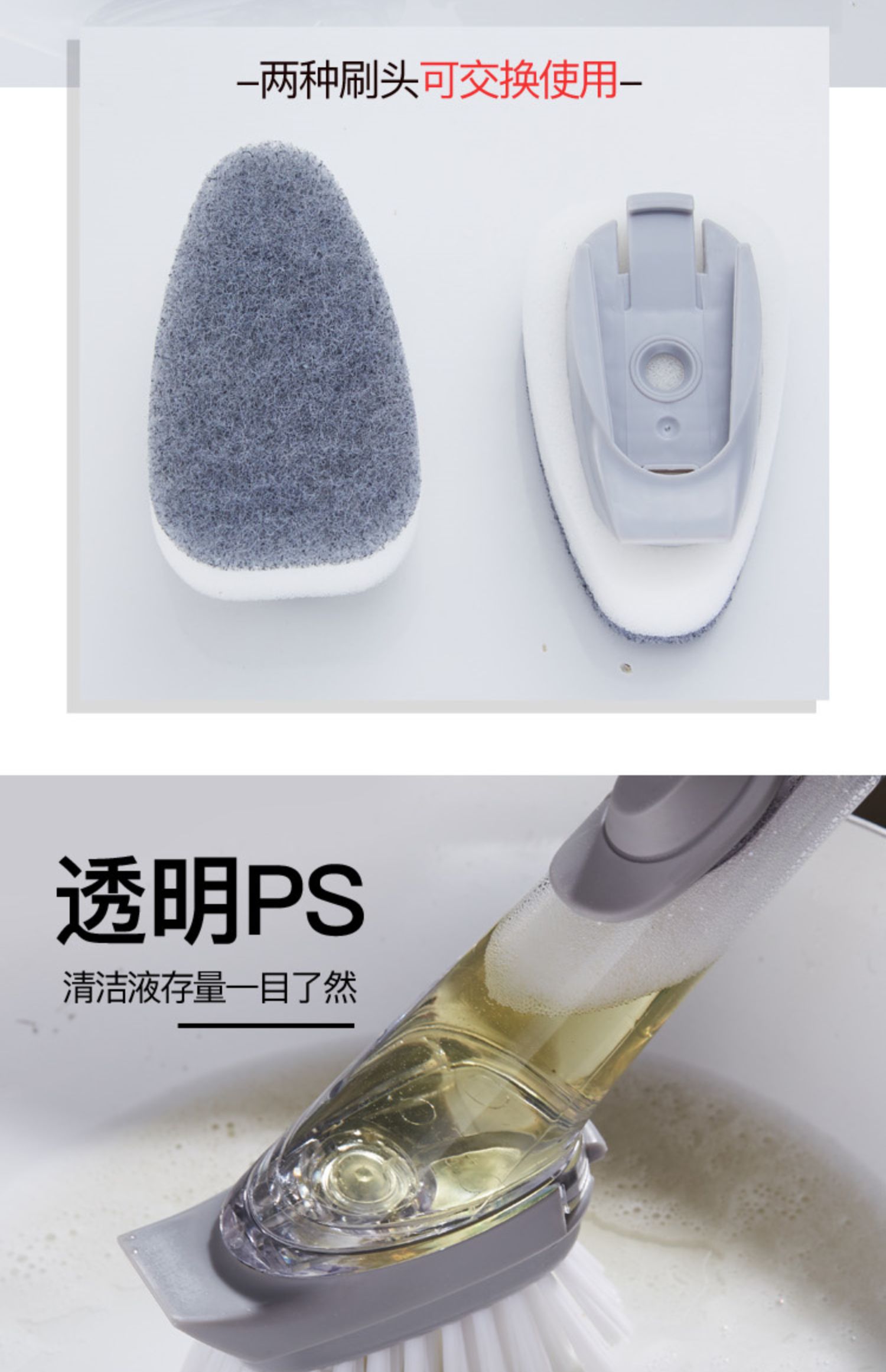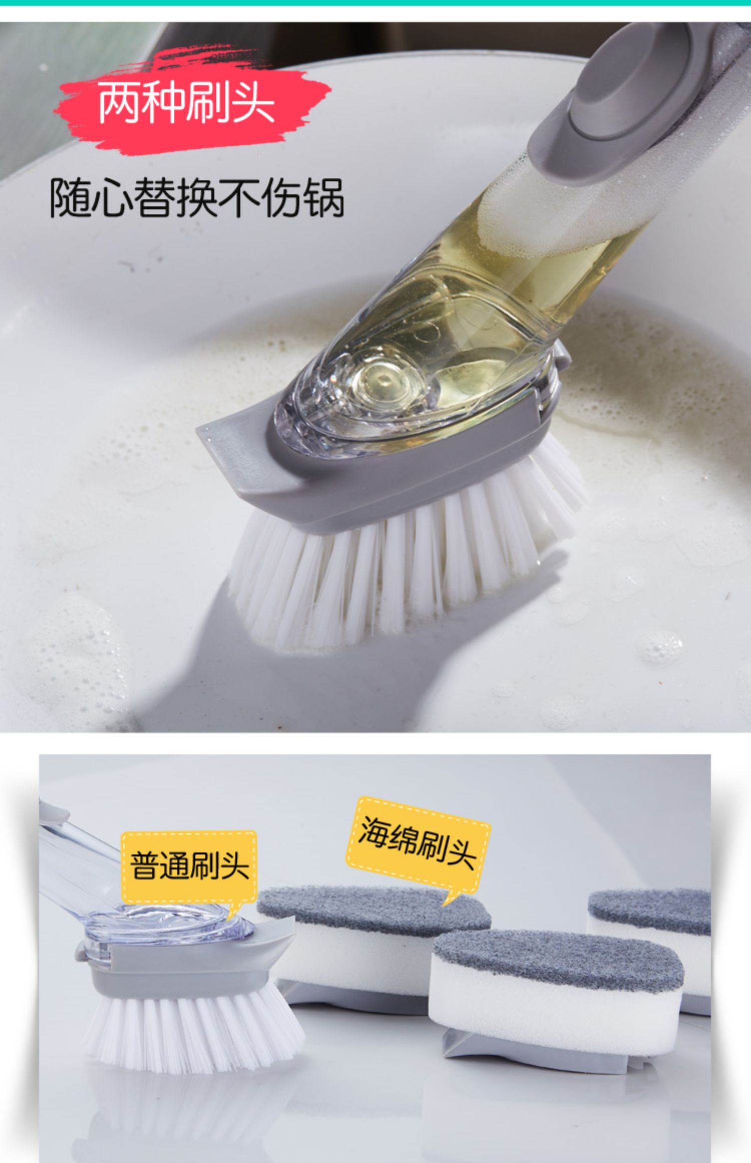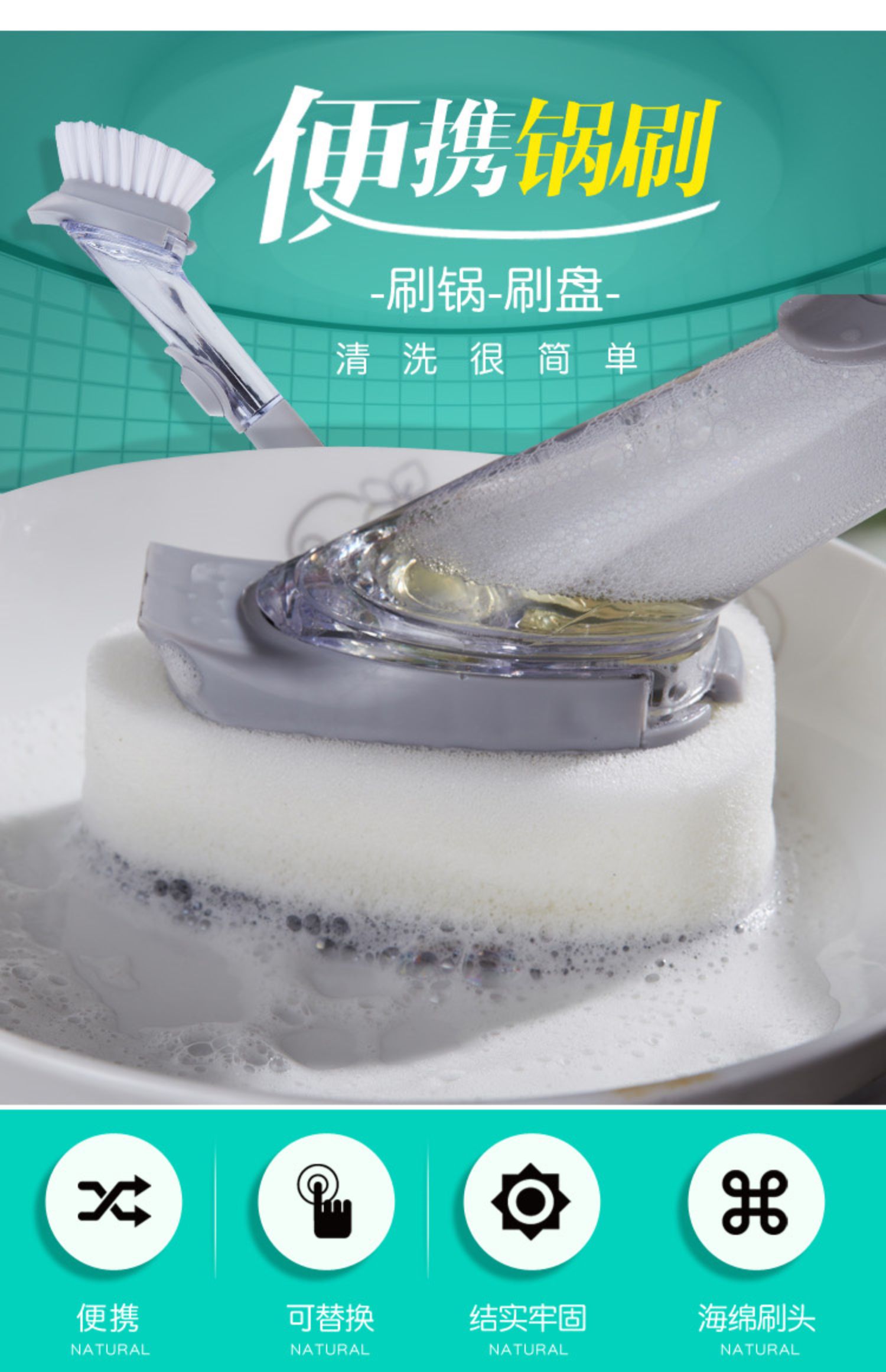 【送4个刷头】刷锅神器。自加液可储存洗洁精。不伤锅具,不粘油污。挤压出液不浪费,保护双手。刷头可轻松替换。背部刮铲轻松去除烧焦锅灰,一刷多用抓紧入手!