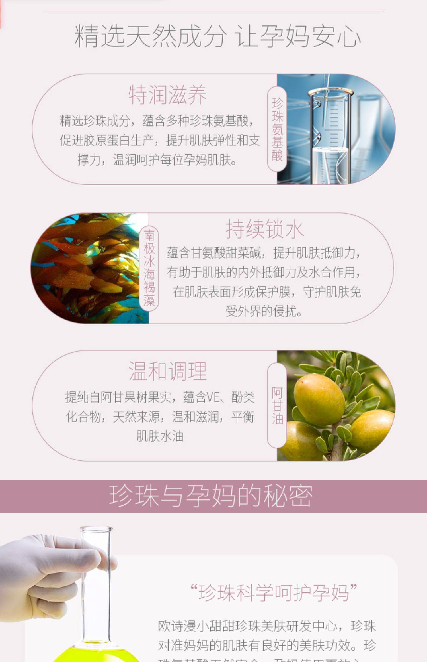 精选珍珠成分,蕴含多种珍珠氨基酸及甘氨酸甜菜碱,提升肌肤抵御力和弹性。备孕期、孕产期及哺乳期肌肤适用,天然安心,来自大自然的瑰宝【赠运费险