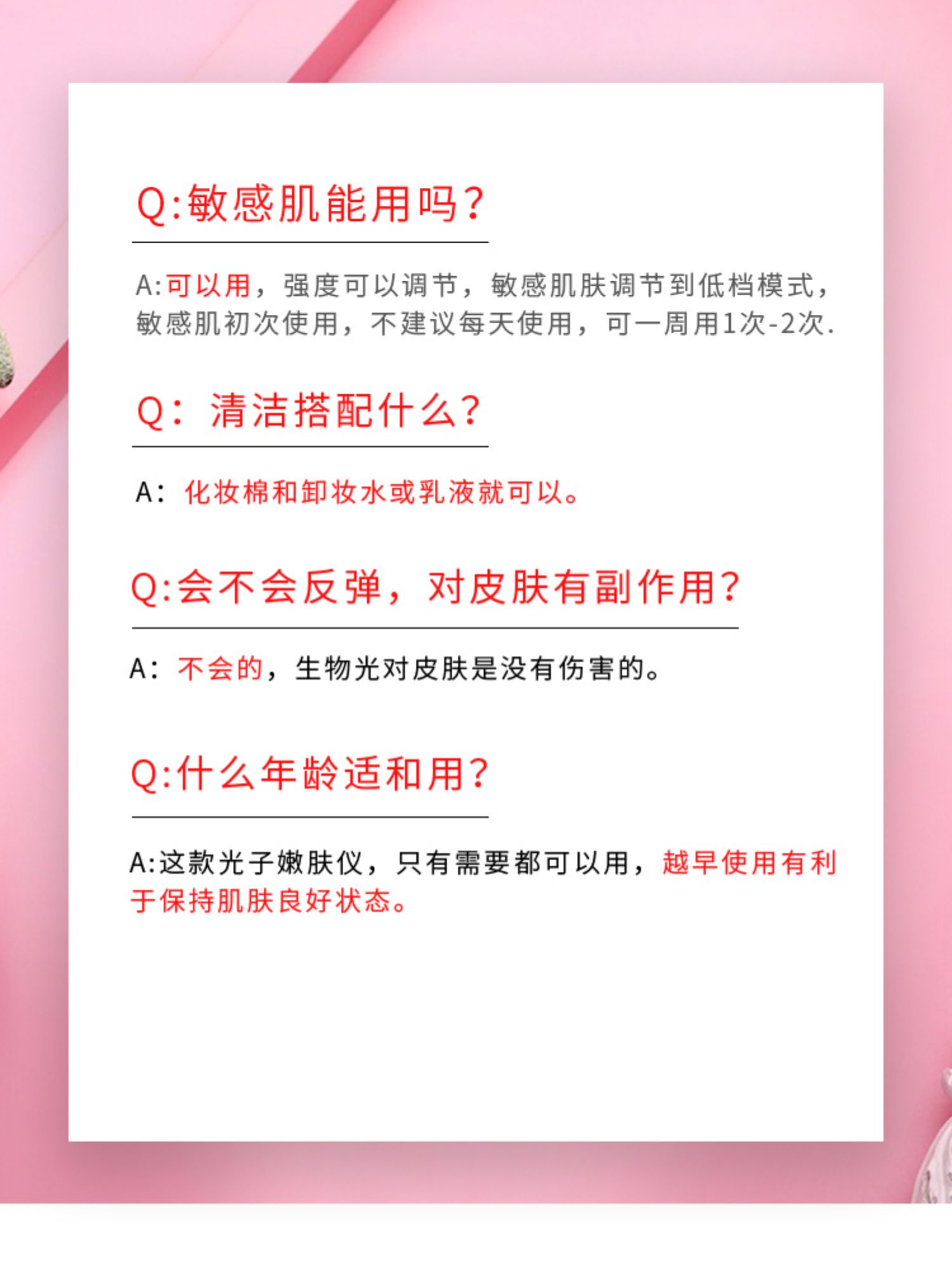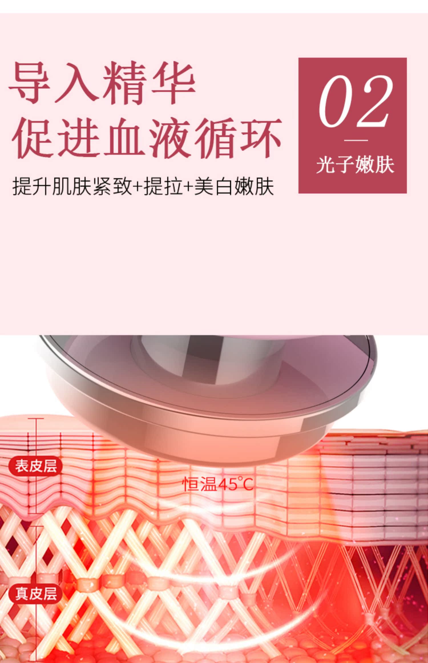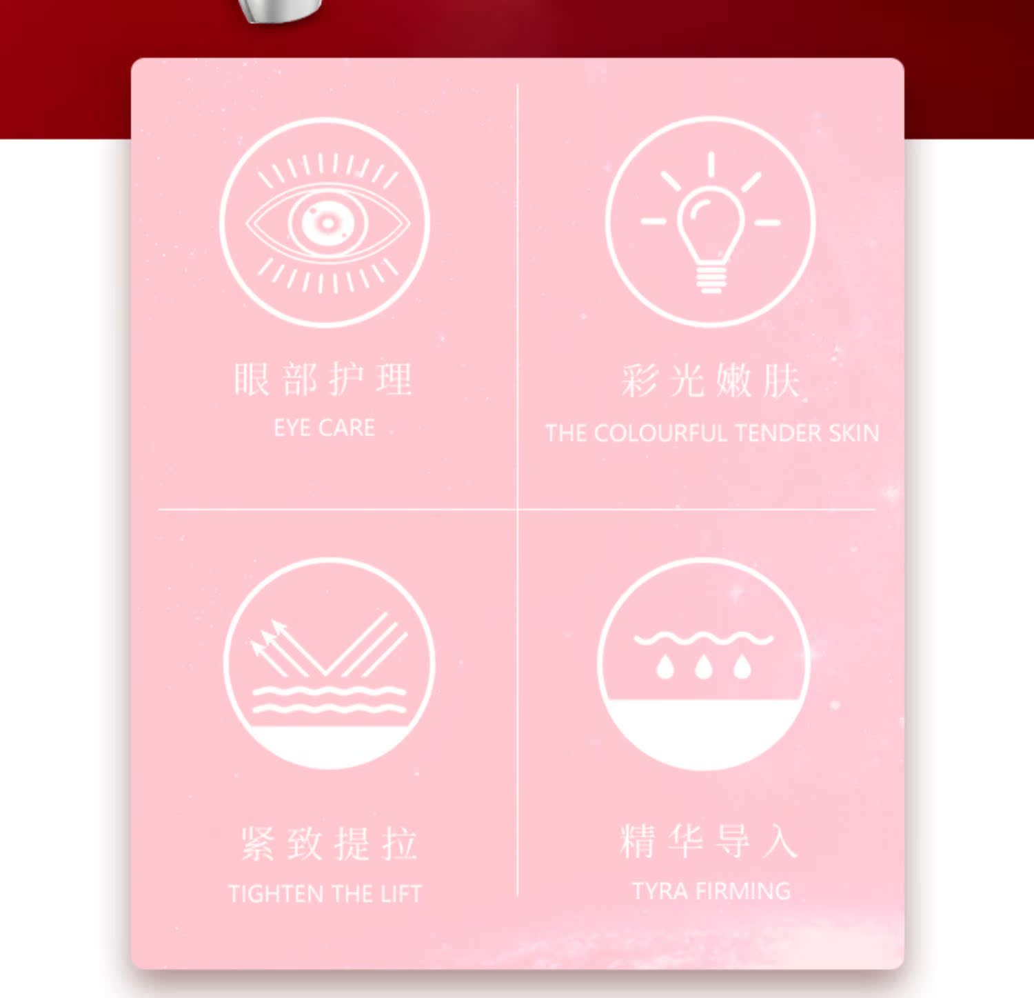 光子嫩肤清洁排毒:深层清洁,净透毛孔。光子嫩肤:导入精华,促进血液循环。紧致提拉:去痘痘粉刺,打造小V脸。眼部护理:声波震动,淡化眼纹。