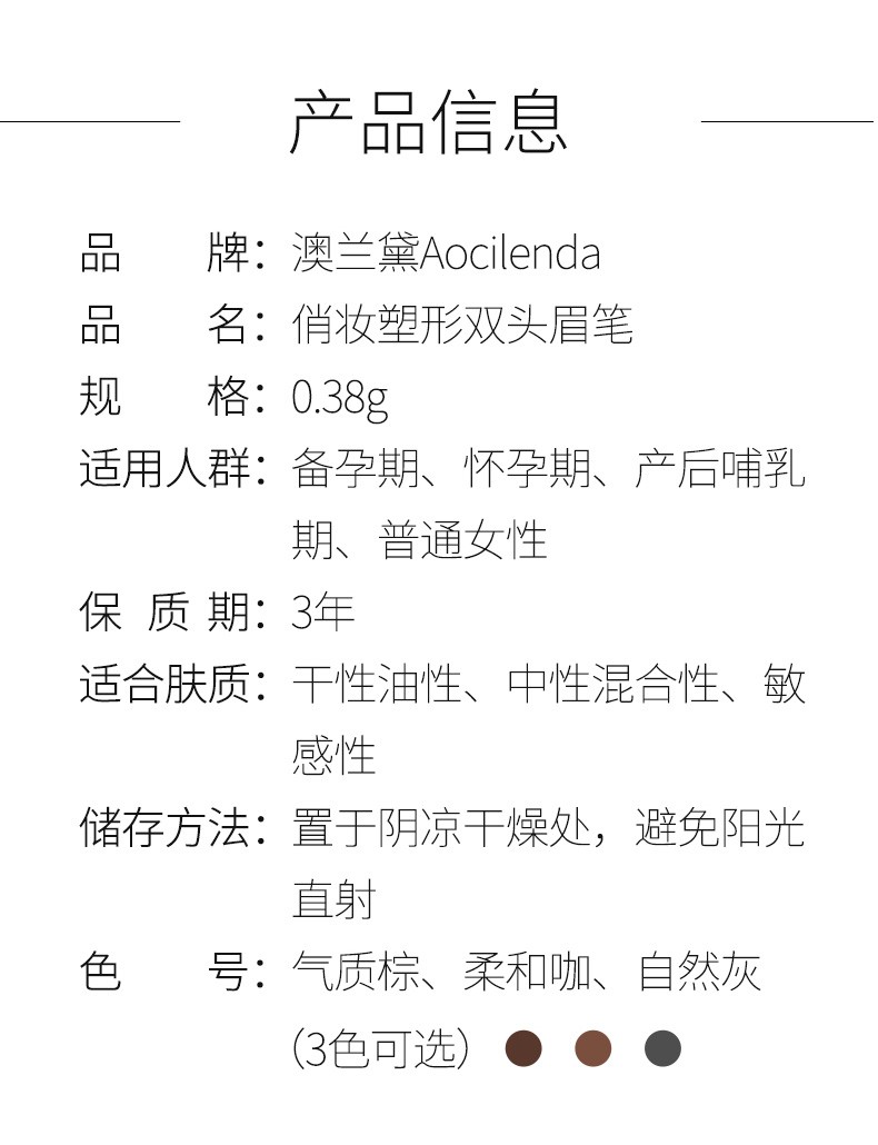 【澳兰黛9.9秒杀】萃取多种自然精华,双头设计,笔触柔滑细腻。浓密双眉,妆感自然,持久上色,防水防汗!三色可选!