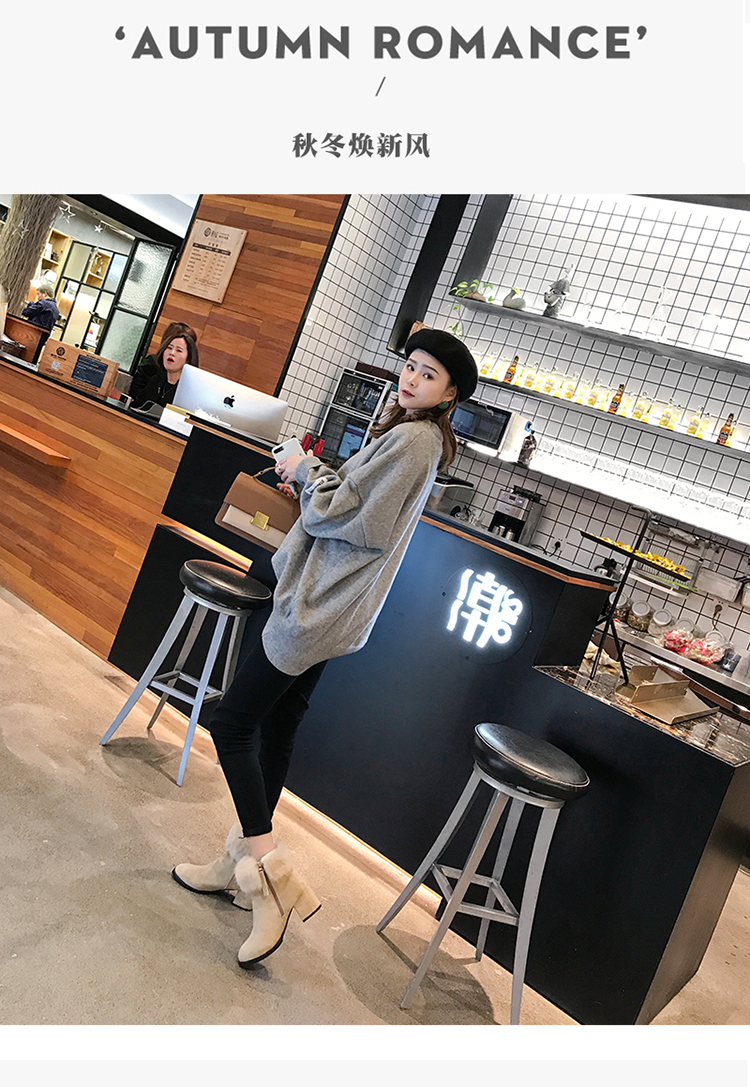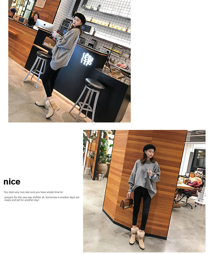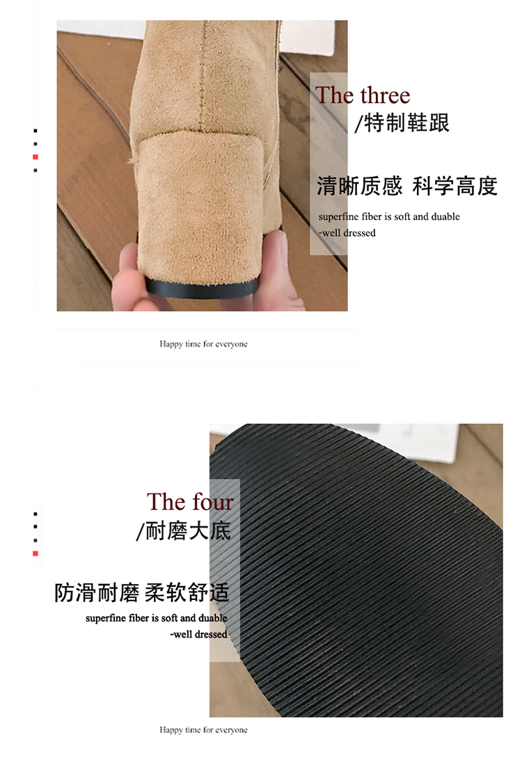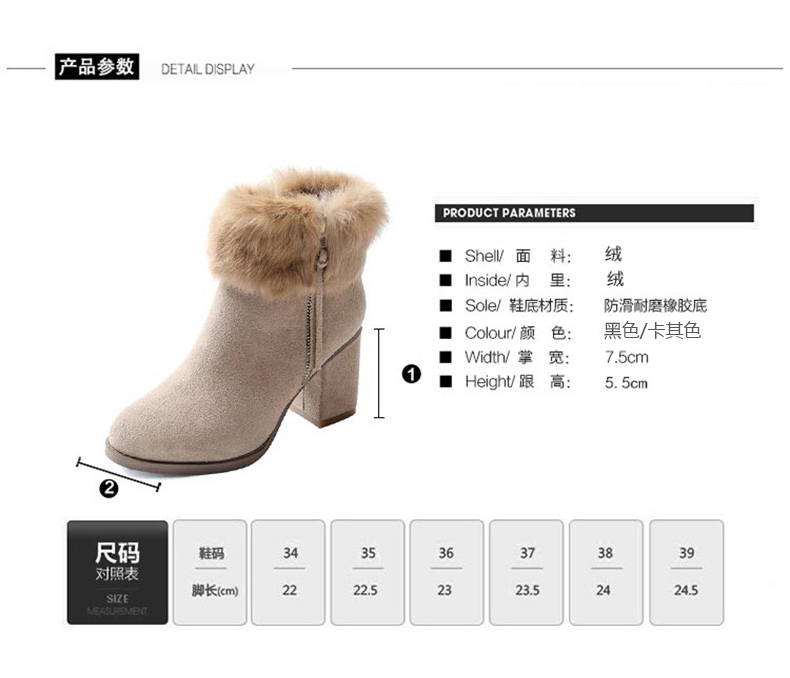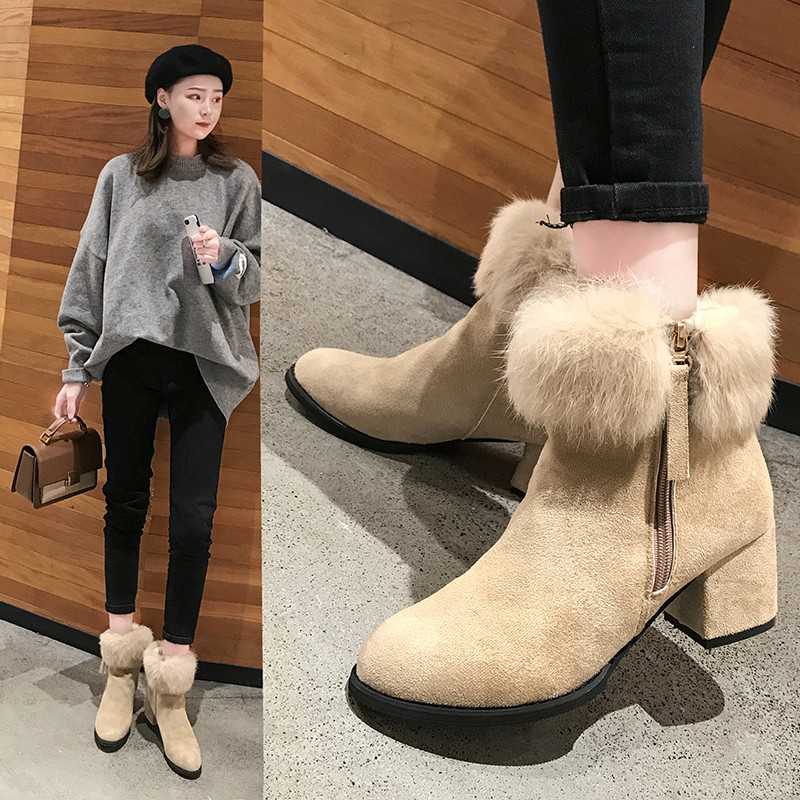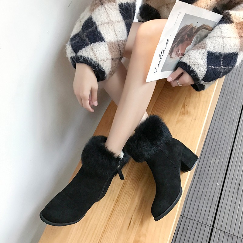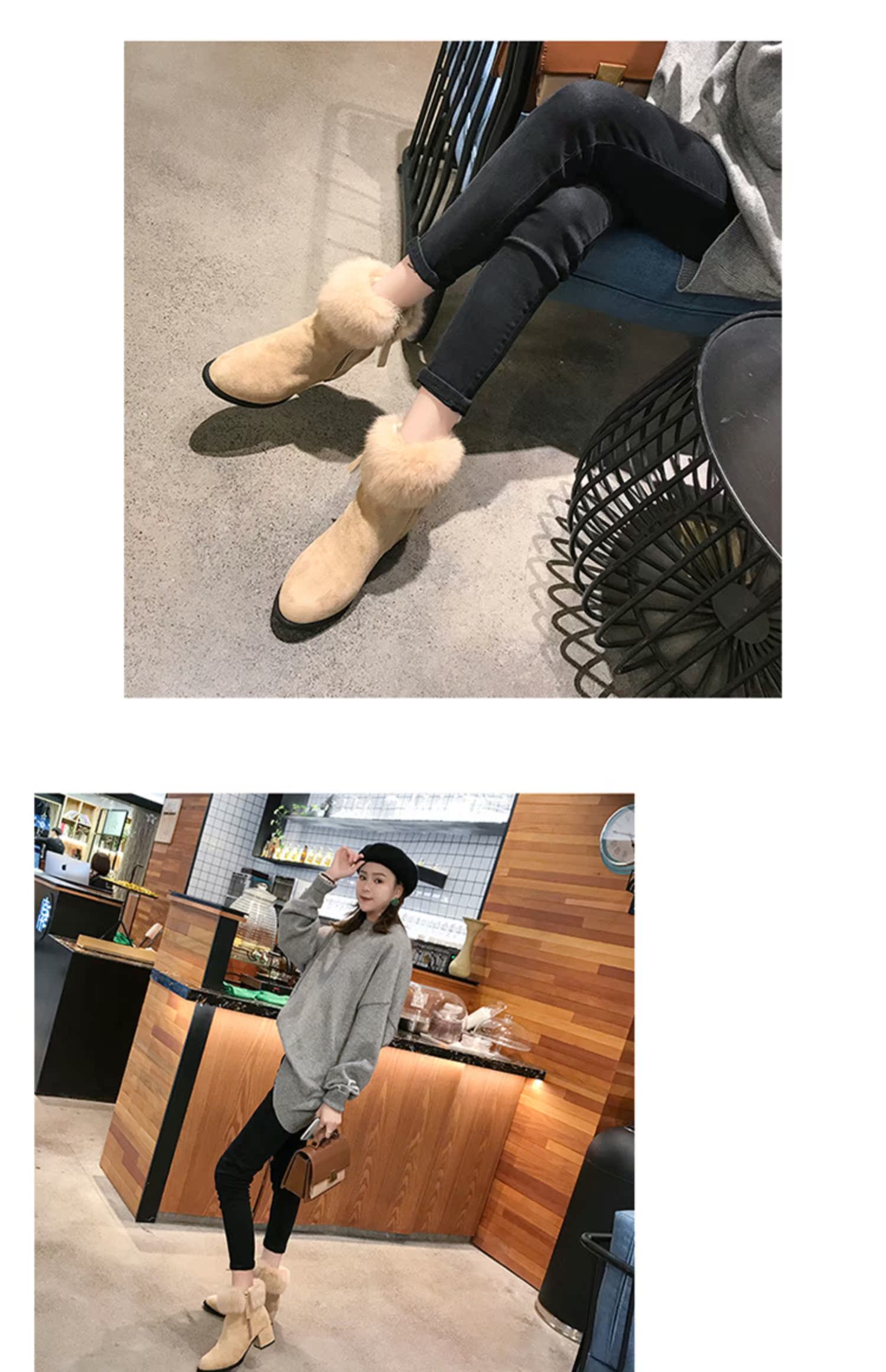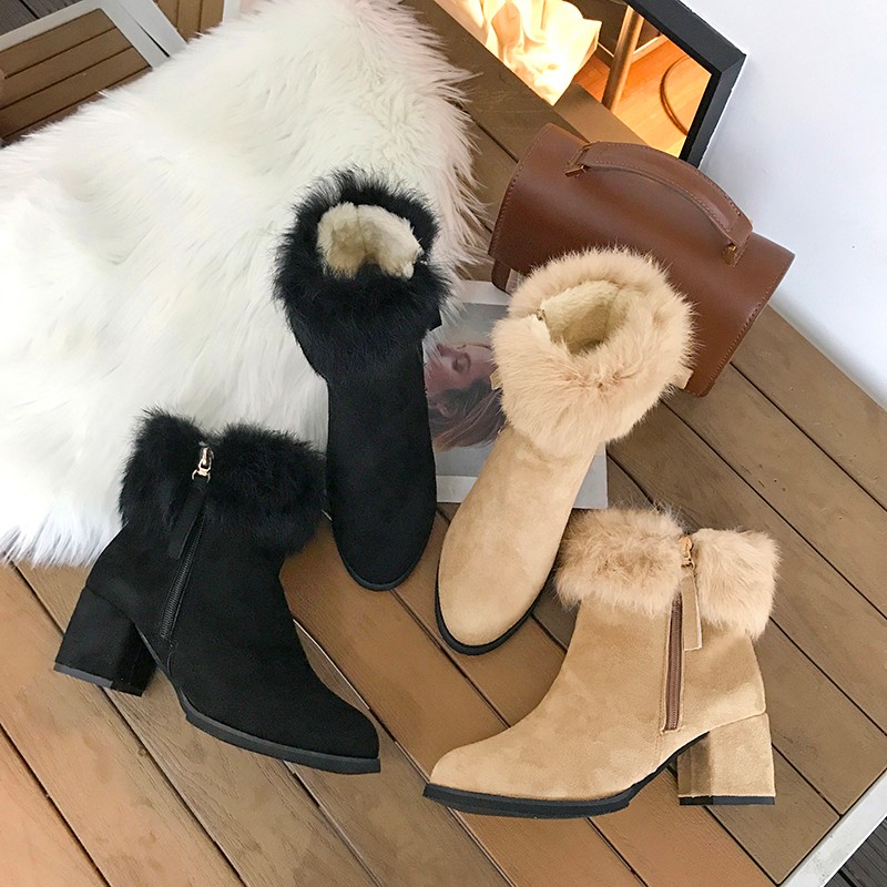 短靴加绒保暖粗跟尖头兔毛马丁靴