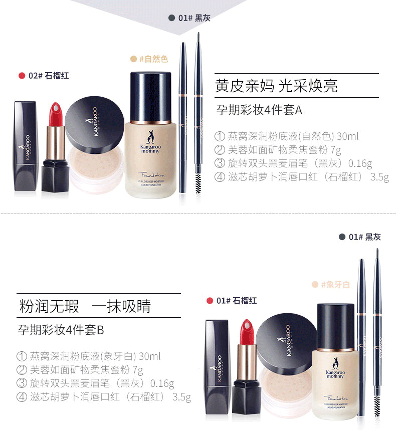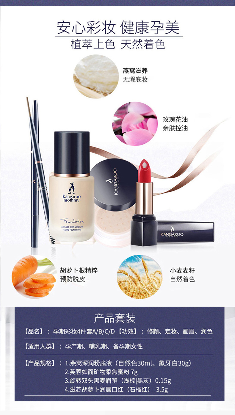 袋鼠妈妈孕期彩妆系列套装,口红,眉笔,粉底液,粉饼一一俱全。植萃孕妆,焕亮高颜值,4种高定组合套装可选,美丽总有一套!【赠运费险】