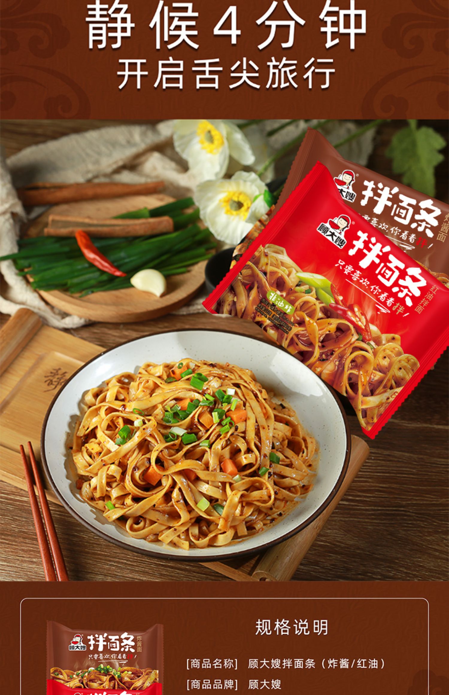 顾大嫂拌面条,早餐速食袋装,懒人食品即食,宿舍吃的零食充饥夜宵整箱,传统风味美食,精选上好牛肉,熬制浓香炸酱,开启舌尖之旅。【七天无理由】
