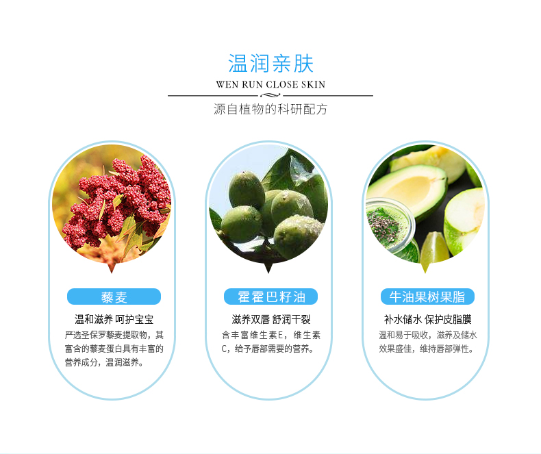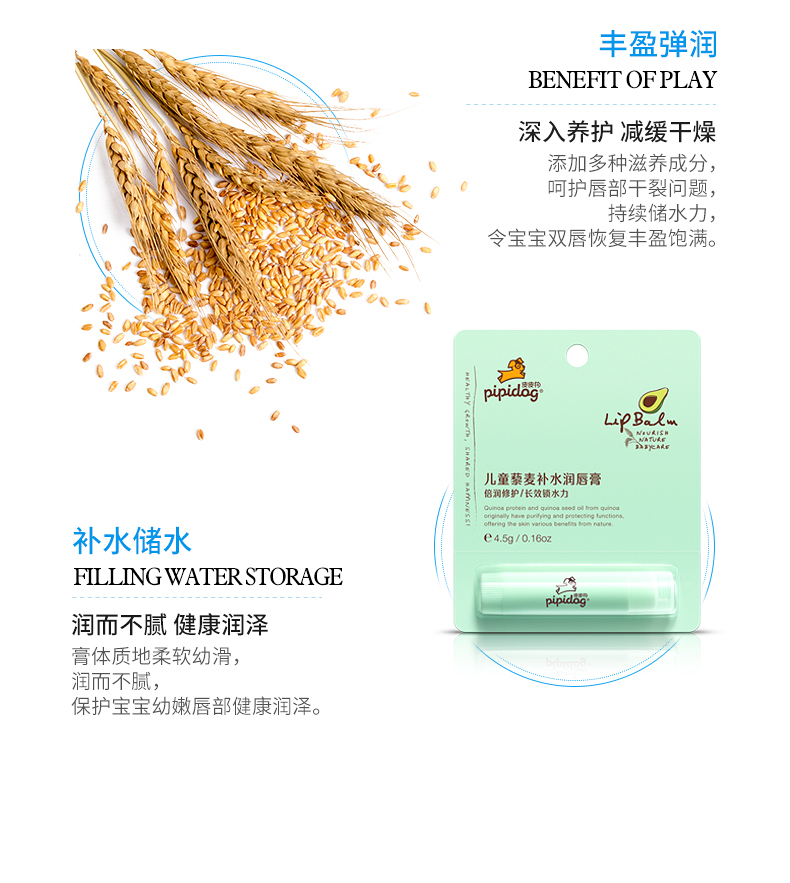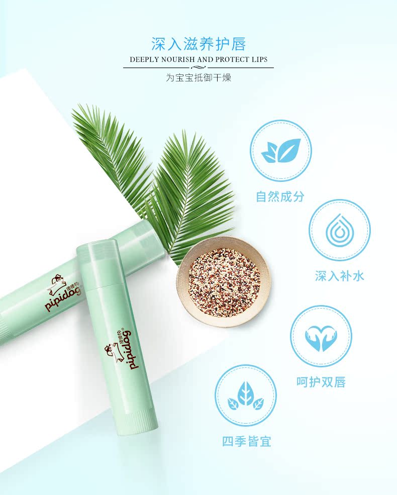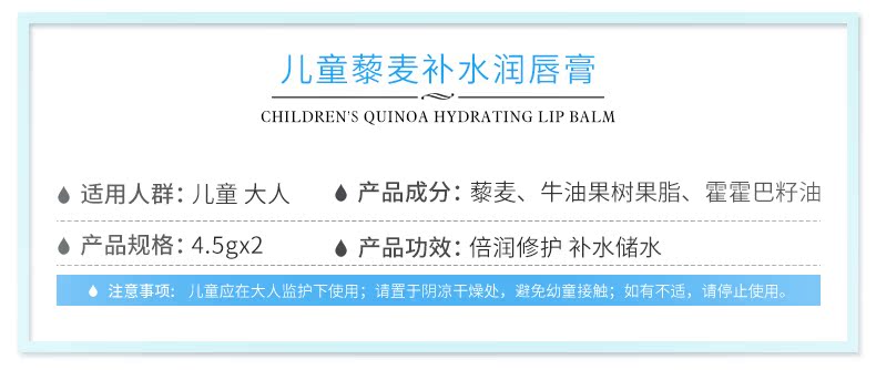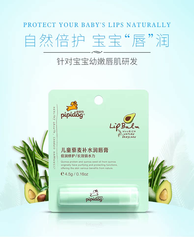 【秋冬必备】针对宝宝幼嫩唇肌研发,富含三大优质用料:圣保罗藜麦,霍霍巴籽油,牛油果树果脂,给足唇部营养,深入滋养润唇,植物护唇,秋冬唇部问题全交给它,男女老少都可用,快快抢购