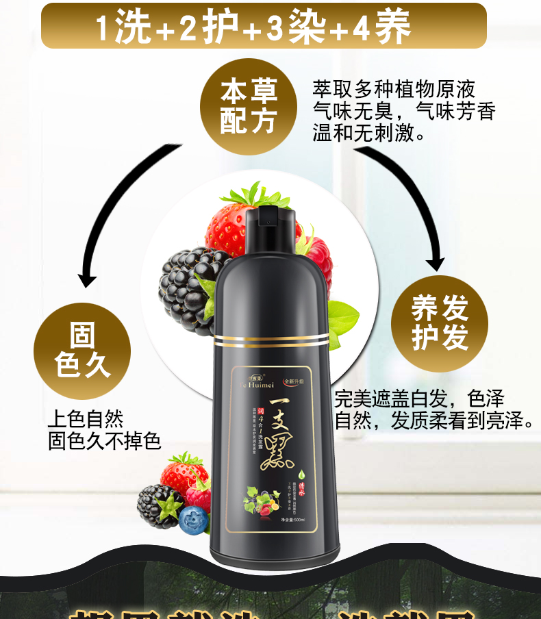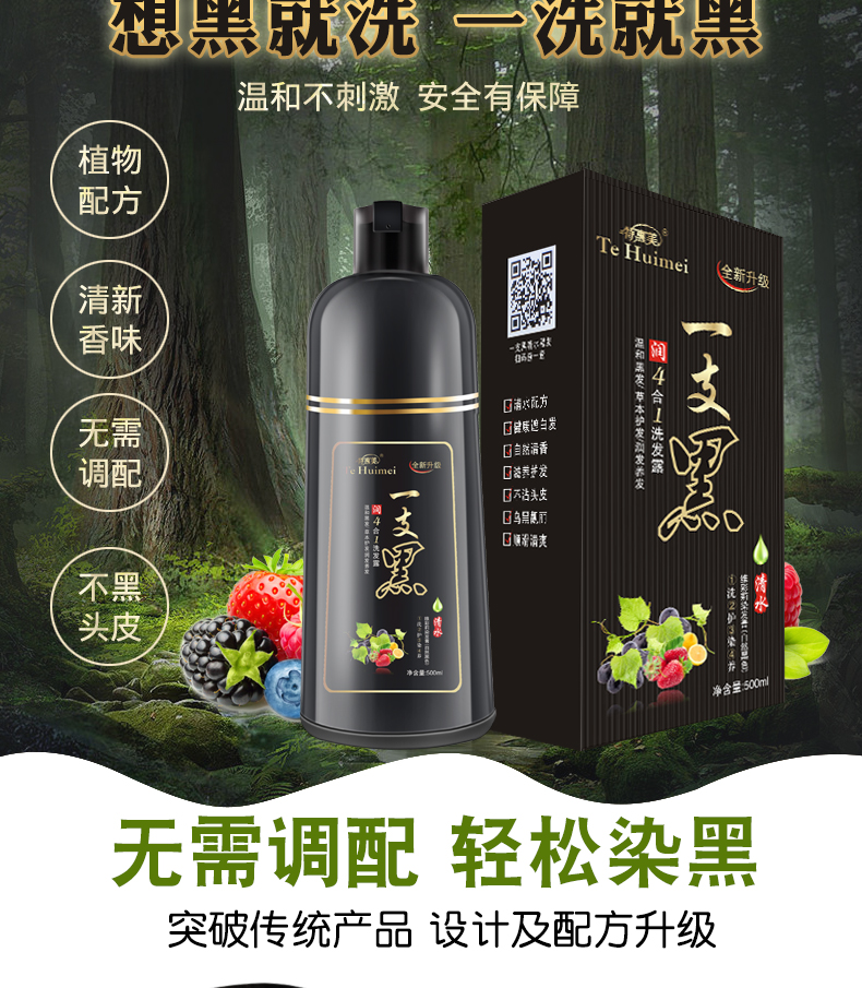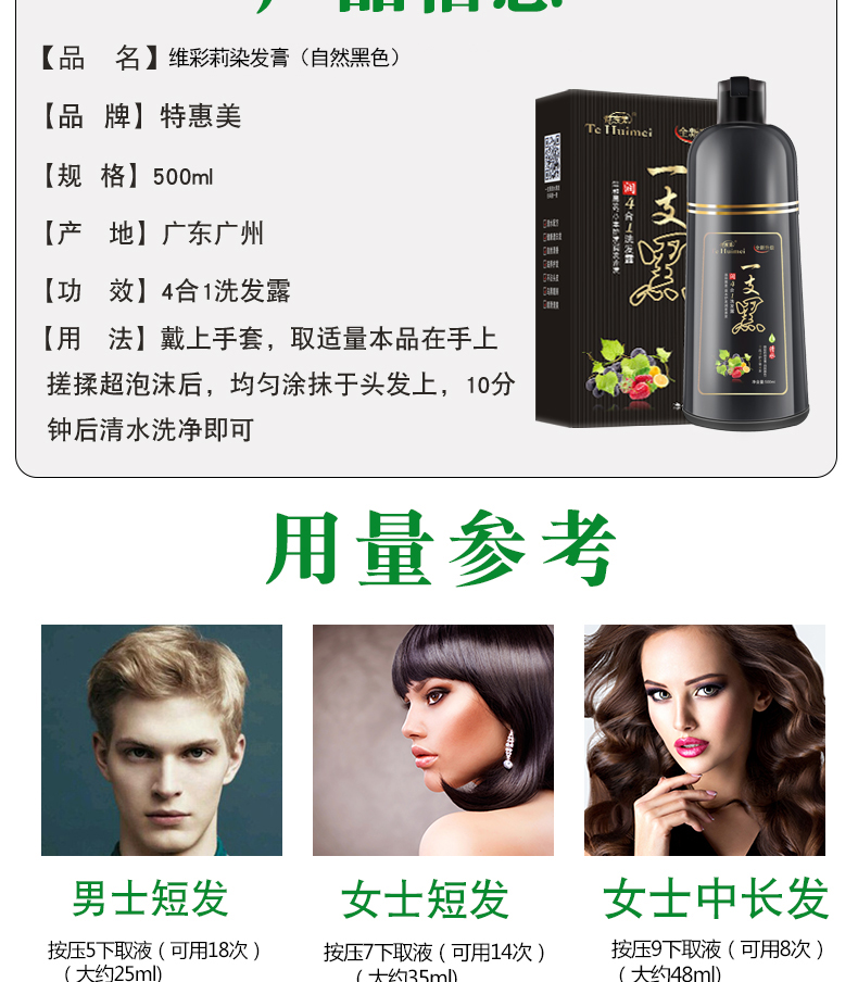 500ml加量升级版,染发剂植物一洗黑洗发水纯自然黑色染发膏天然无刺激一支黑绿色配方,只黑头发不黑头皮,健康黑发加量升级版